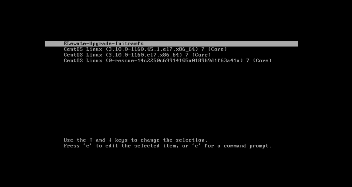rebootA new entry in GRUB called ELevate-Upgrade-Initramfs will appear. The system will be automatically booted into it.