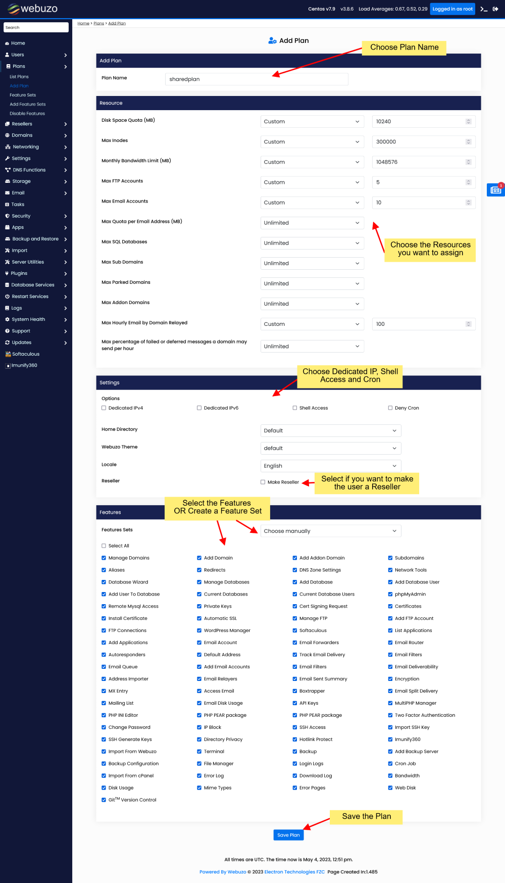 A Plan can be created when you are logged into Webuzo panel as root or a reseller user.