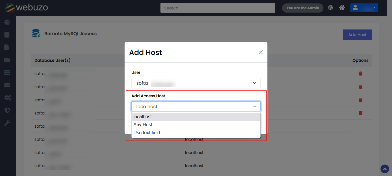 Go to Webuzo Enduser Panel > Database > Remote MySQL Access