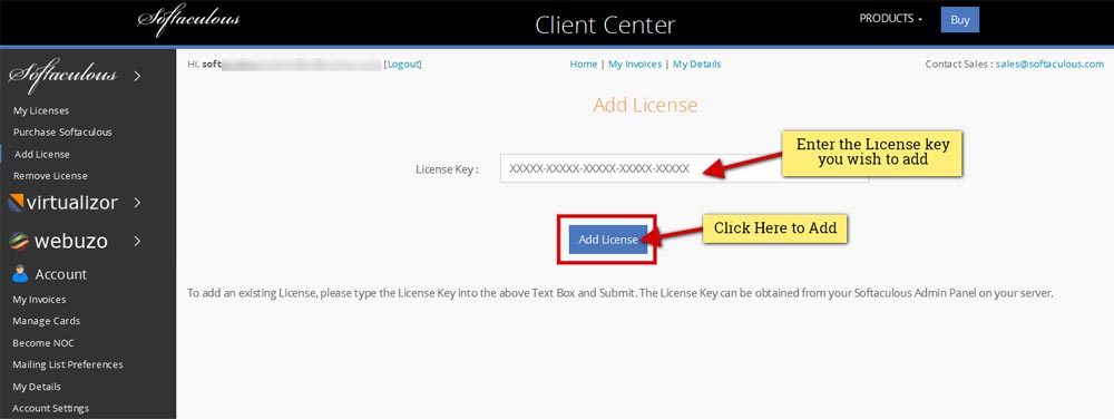If you have an existing license (can be found in the Webuzo Admin Panel of your server) enter the License Key on the Add License page. After adding your license key it will start showing in the Clients Area. A screenshot of the Clients Area is given below :