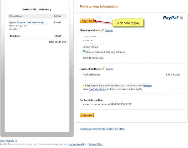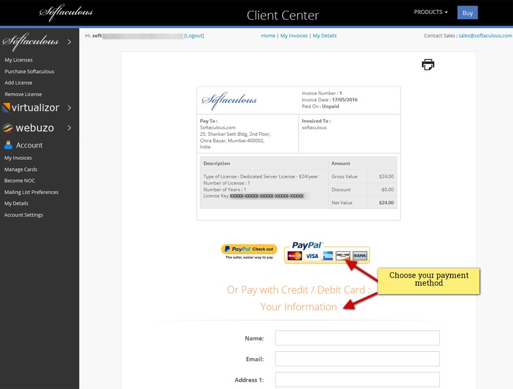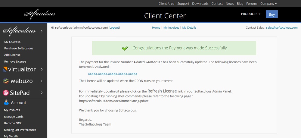 When you pay for the invoice PayPal will redirect you to the Softaculous Client Area. It will show that the Payment was made Successfully and your License has been activated.