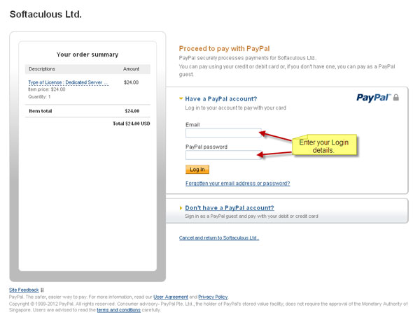 On clicking the Purchase Button an Invoice is generated and you will be Redirected to the Invoice. You may now proceed to pay the Invoice. Click on the PayPal button which reads as Check out with PayPal. It will redirect you to the Paypal Payment Page which is a Secured Gateway to Pay. You can also pay with your Credit Card.