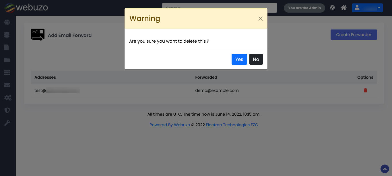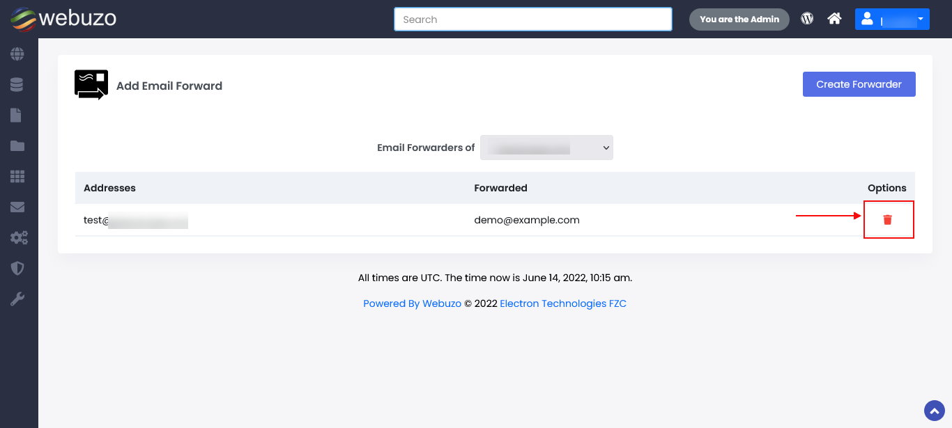 - Click on the DELETE icon to delete any of the Email Forwarder.
