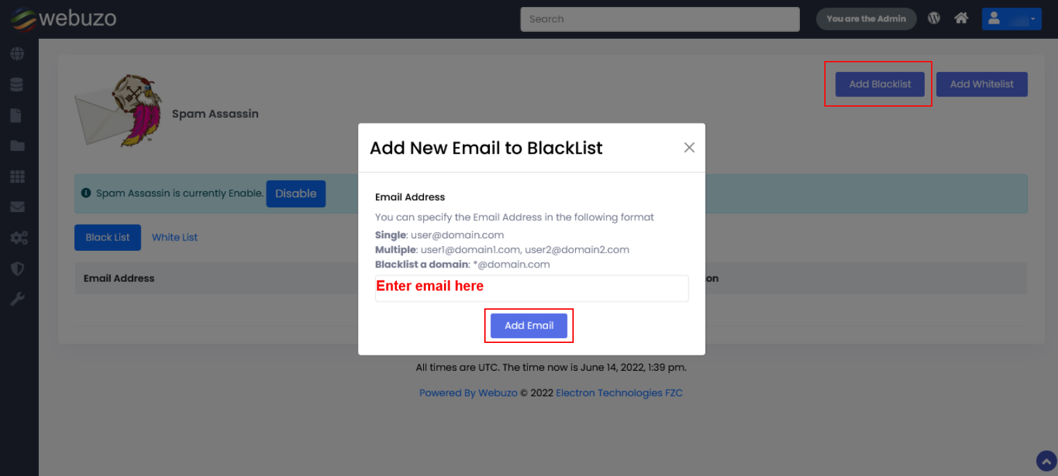 Click on Add Blacklist > Enter an email > click on Add Email.