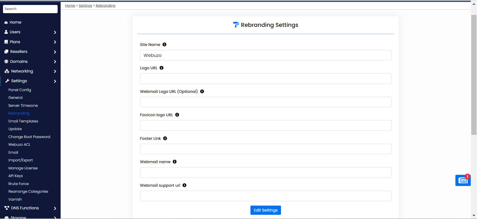 - Go to Webuzo Admin Panel and click on Settings Tab > Rebranding menu.