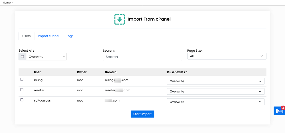 3) [Improvement] Improved the Enduser cPanel importer and added support for importing PHP versions of domains, Email passwords, FTP passwords, User account password, Cron jobs and Email Forwarders.
